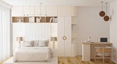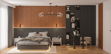 W części prywatnej zaprojektowano sypialnię z zabudową meblową na wymiar, łączącą funkcję przechowywania z miejscem do pracy. Miękkie tkaniny, zintegrowane oświetlenie oraz konsekwentnie prowadzona linia materiałowa tworzą spokojne, sprzyjające odpoczynkowi wnętrze.
