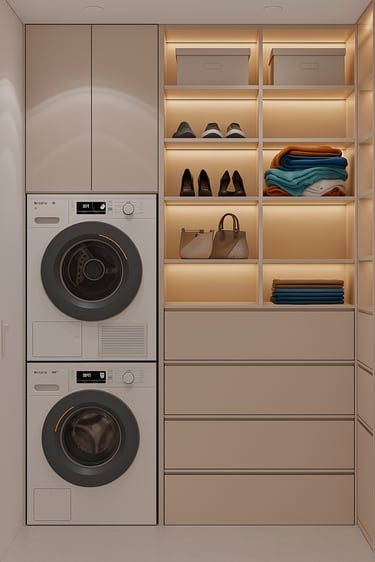 Całość uzupełniają przemyślane rozwiązania funkcjonalne – garderoba oraz strefa pralni – zaprojektowane tak, aby maksymalnie wykorzystać dostępną przestrzeń, nie tracąc przy tym estetycznej spójności z resztą apartamentu.