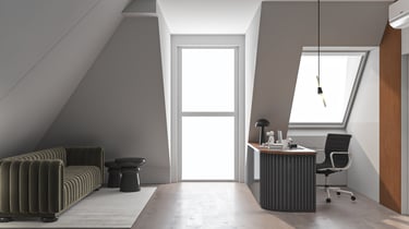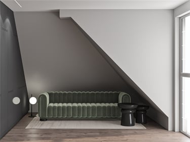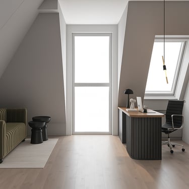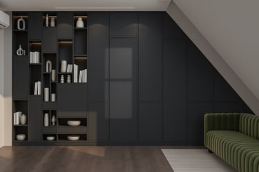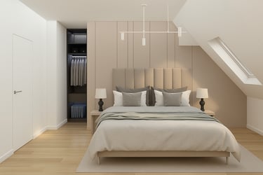 Część prywatna obejmuje sypialnię oraz gabinet, zaprojektowane z uwzględnieniem nietypowej geometrii przestrzeni i skosów. Zabudowy meblowe na wymiar pozwoliły na maksymalne wykorzystanie dostępnej powierzchni, jednocześnie zachowując wizualny porządek. Zastosowanie miękkich form, tapicerowanych elementów oraz subtelnego oświetlenia sprzyja wyciszeniu i odpoczynkowi.
