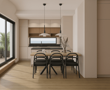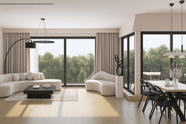 Strefa dzienna została zaprojektowana w oparciu o otwarty układ funkcjonalny, łączący salon, jadalnię oraz kuchnię w spójną całość. Jasna, neutralna paleta barw została wzbogacona o naturalne drewno oraz ciemniejsze akcenty, które porządkują przestrzeń i nadają jej elegancki charakter. Duże przeszklenia oraz miękkie tkaniny podkreślają lekkość wnętrza i zapewniają komfort codziennego użytkowania.