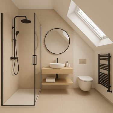 Łazienka została utrzymana w stonowanej, ciepłej kolorystyce, z wykorzystaniem prostych form, naturalnych materiałów i kontrastujących detali w ciemnym wykończeniu. Całość projektu łączy spójna linia materiałowa oraz konsekwentnie prowadzona estetyka, podkreślająca elegancję i funkcjonalność wnętrza.